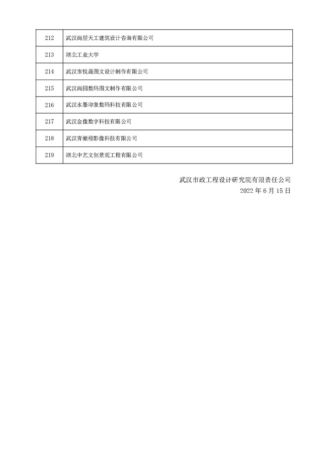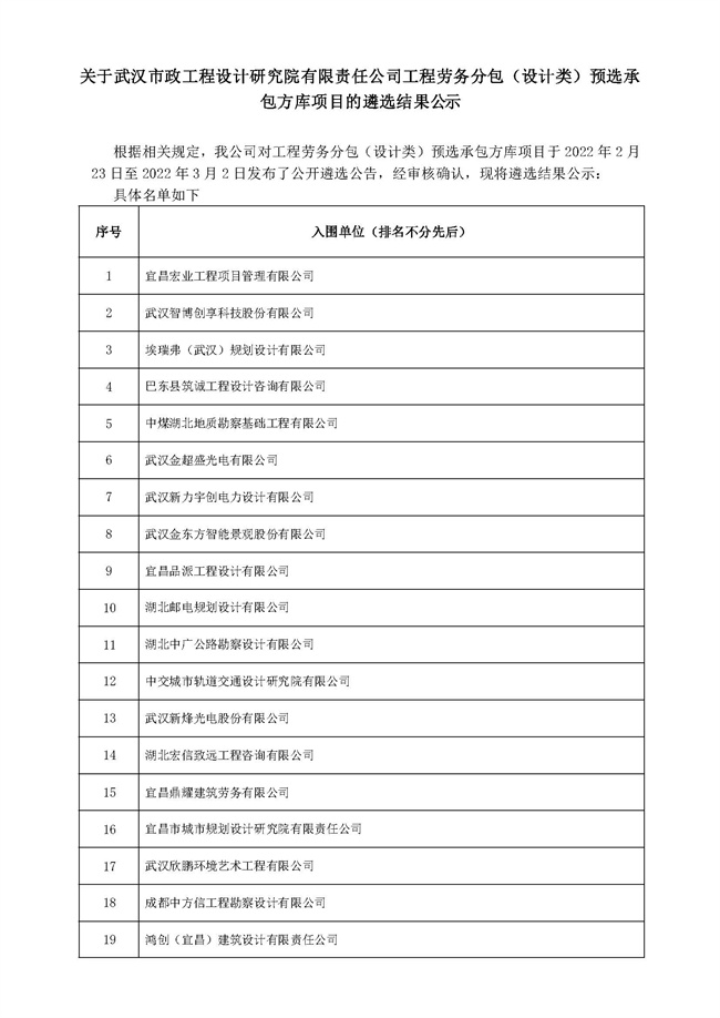 關(guān)于武漢市政工程設(shè)計(jì)研究院有限責(zé)任公司工程勞務(wù)分包(設(shè)計(jì)類(lèi))預(yù)選承包方庫(kù)項(xiàng)目的遴選結(jié)果公示